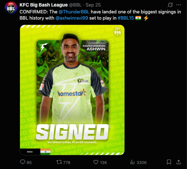 “From the first time we spoke, Ashwin impressed everyone at the Thunder with his passion, desire to win and understanding of what makes our club special,” said the Sydney Thunder General Manager Trent Copeland. “He will bring world-class bowling mid-tournament, while his presence as a leader and mentor will be invaluable.”